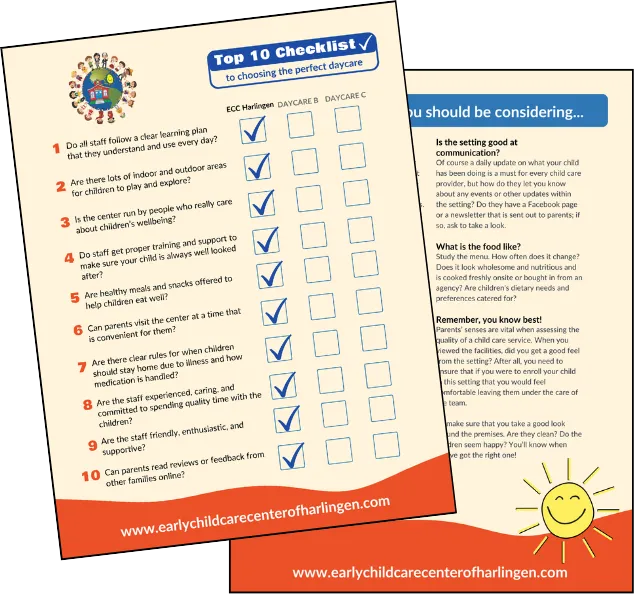 Get an inside look at Early Childcare Center of Harlingen! Our FREE Parent Pack is packed with valuable information about our programs, philosophy, and everything that makes our center a warm and welcoming environment for your child to learn and grow.